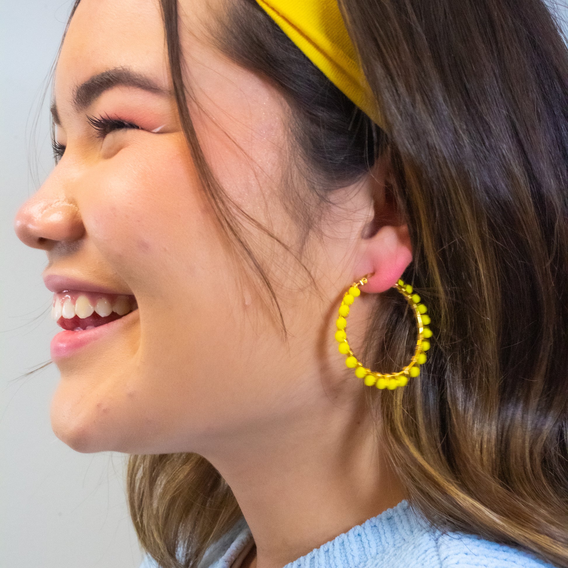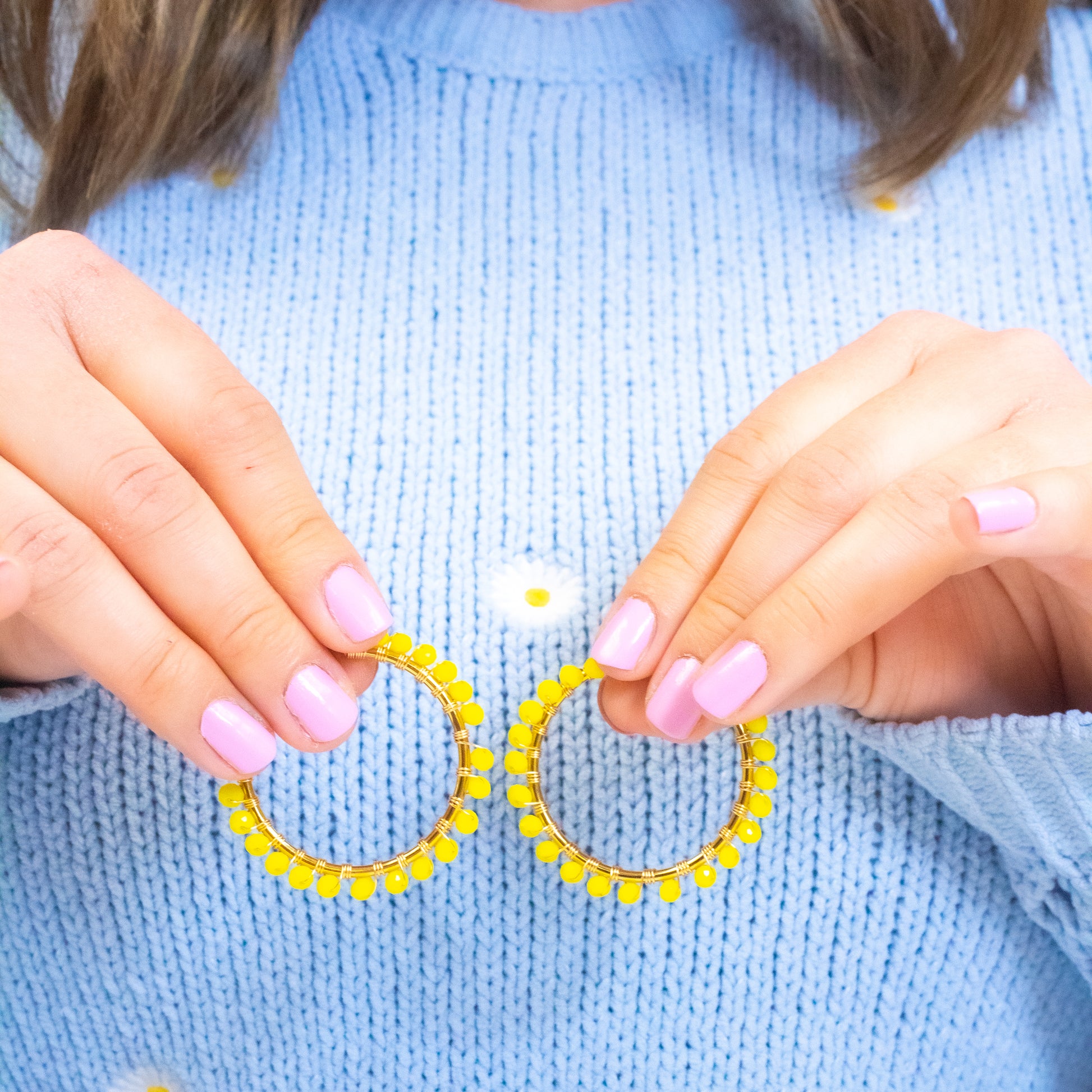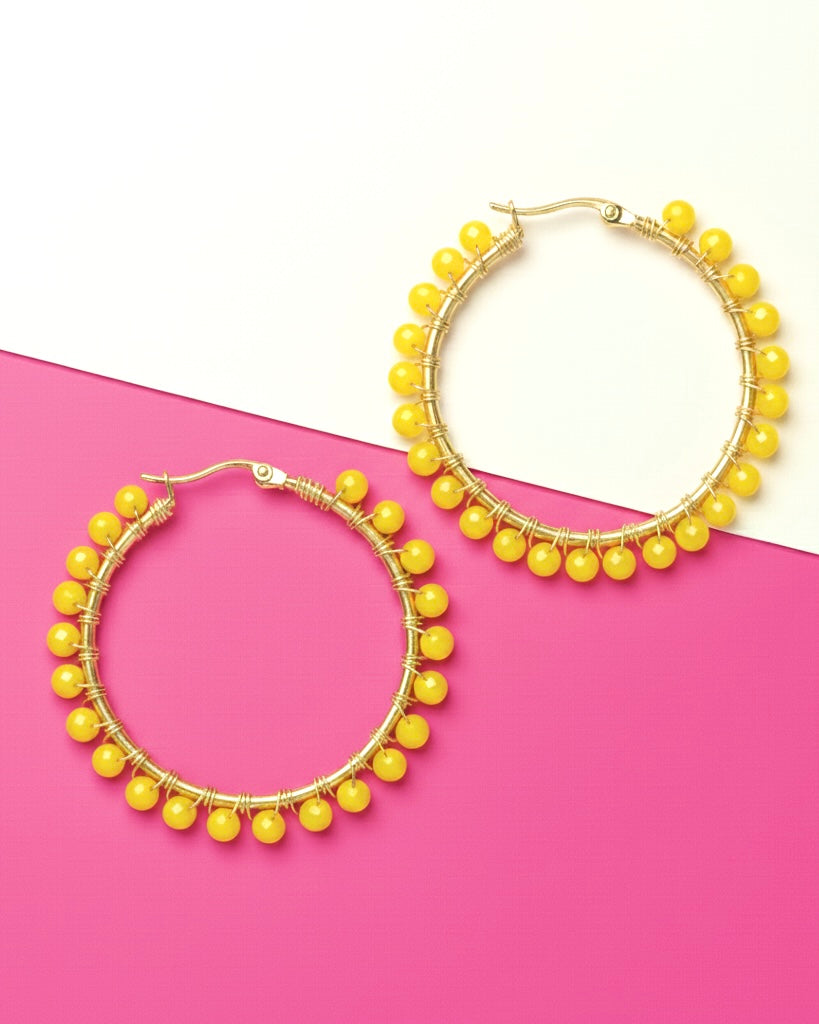The Cycely handmade hoop earrings; are inspired by the 2022 Fashion Trends. The elegant circle frame and colorful beads complement perfectly with any type of face giving a spark to everyone's life. Made in vibrant colors like blue, yellow, royal blue, and our mix of pastel these hoop earrings will definitely catch the eye of everyone next to you.