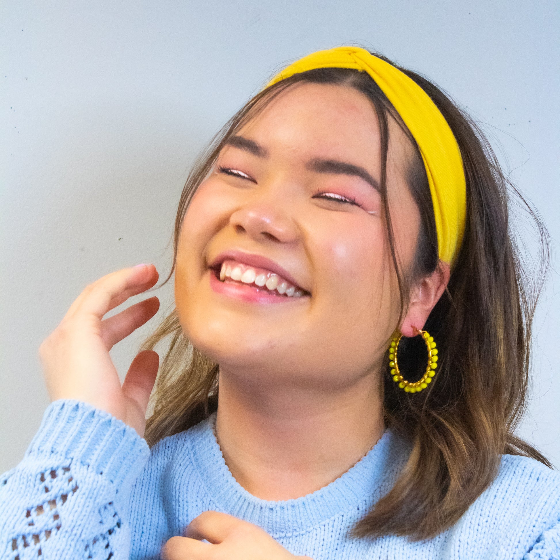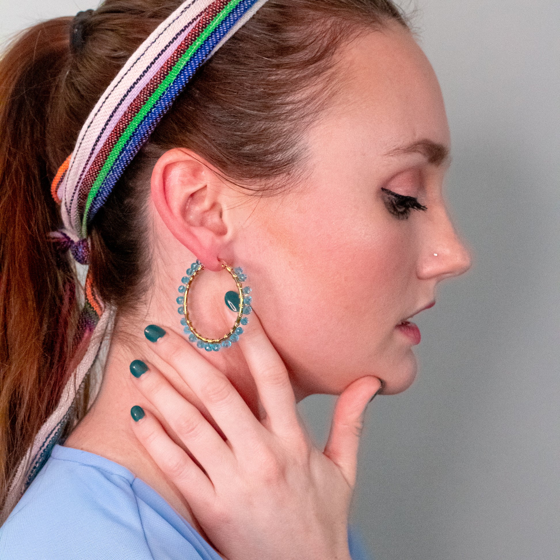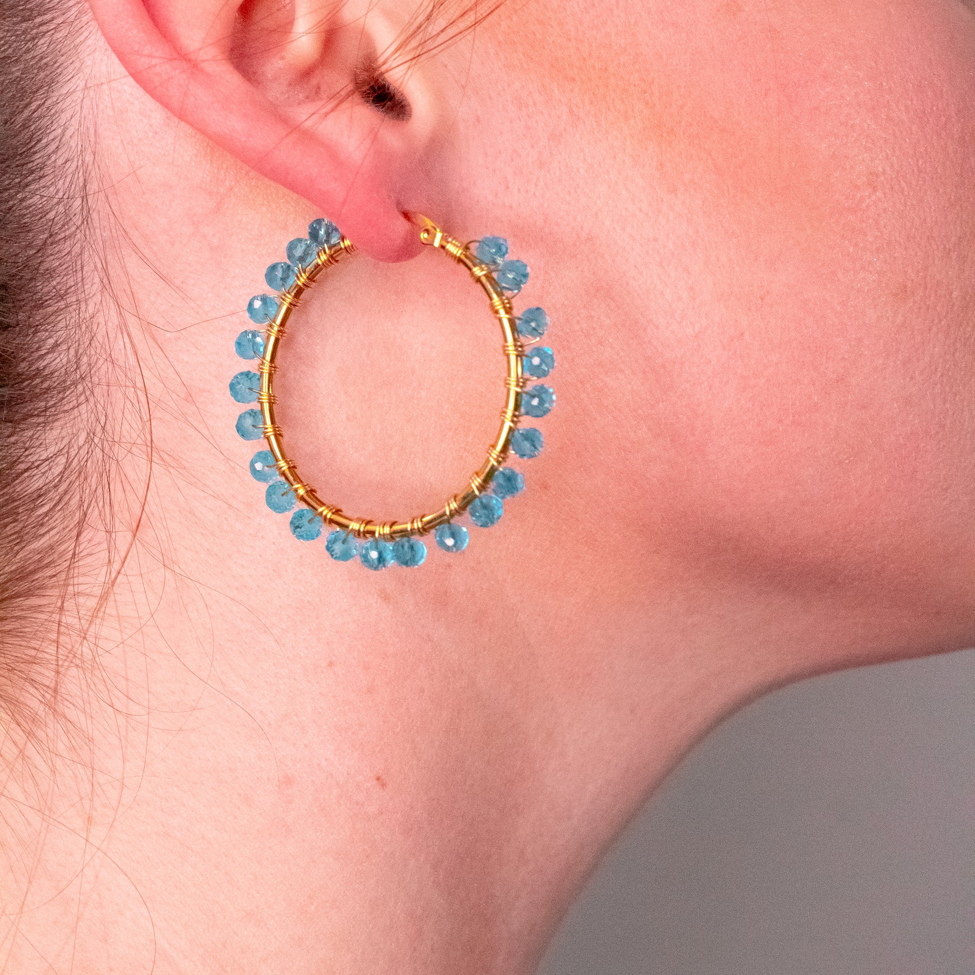 The Cycely handmade hoop earrings; are inspired by the 2022 Fashion Trends. The elegant circle frame and colorful beads complement perfectly with any type of face giving a spark to everyone's life. Made in vibrant colors like blue, yellow, royal blue, and our mix of pastel these hoop earrings will definitely catch the eye of everyone next to you.