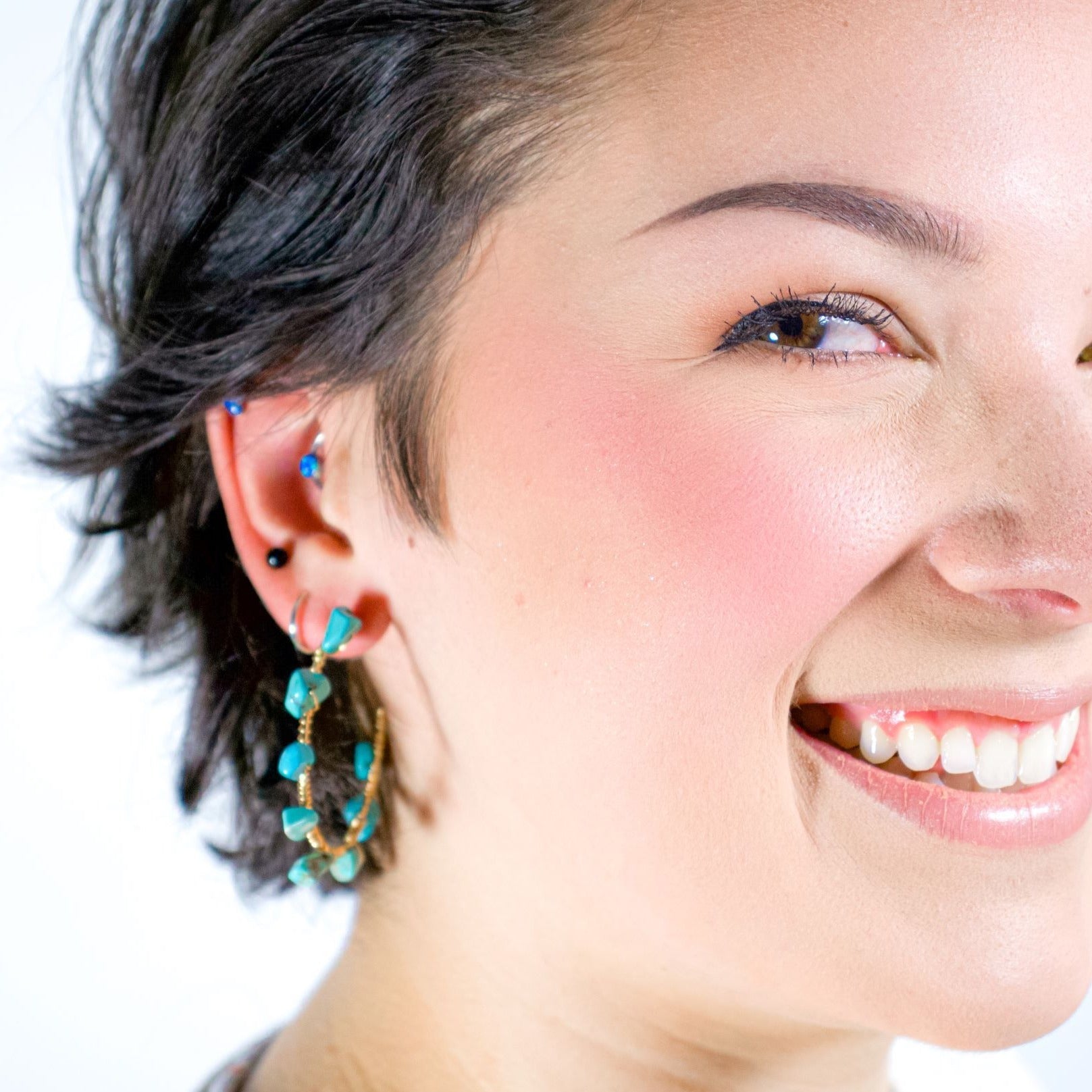 You will love this beautiful design. Our Jasper is one of our best sellers and you can tell why! This design including real aqua or lilac quartz stones will make your day magical. Perfect to elevate any outfit.